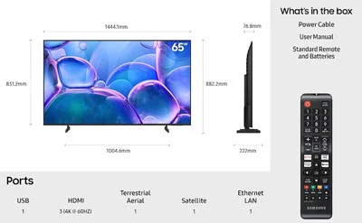 تلویزیون سامسونگ 65U7000F یکی از تولیدات اقتصادی سامسونگ در نوع خود به شمار می آید. دارای نمایشگر 65 اینچ بوده و از سری نمایشگرهای با تکنولوژی کریستالی Crystal UHD است. کیفیت تصویر 4K میباشد و تصویر عالی و با رنگ و وضوح طبیعی را با خود به همراه دارد. مجهز به وضوح یا رزولوشن 3840×2160 پیکسل بوده و چهار برابر نمایشگرهای فول اچ دی تصویر عالی تری به نمایش در می آورد. از دیگر خصوصیات مهم که در این دستگاه ساخت شرکت سامسونگ میتوان به آن اشاره کرد پردازنده ای میباشد که سامسونگ در داخل آن قرار داده است. از پردازنده Crystal Processor 4K برخوردار است و قابلیت ارتقاء کیفیت تصویر Upscaling دارد. پردازنده عالی بوده که باعث بهبود رنگ و کنتراست میشود. کار پردازنده تنها در ارائه تصویر با کیفیت نیست و در بخش صدا و سیستم صوتی تلویزیون نیز نقش فوق العاده ای دارد. برای نمایش دادن تصویر با رنگ طبیعی و وضوح و روشنایی عالی فناوری HDR با پشتیبانی از فرمت های جدیدتر آن نظیر HDR10، HDR10+ و HLG به کار رفته است. نرخ تازه سازی یا رفرش ریت تلویزیون سامسونگ برابر 60 هرتز میباشد. برای گیمینگ در حد متوسط تلویزیونی مناسب است اما برای سطح حرفه ای مناسب نیست. در واقع ویژگی های گیمینگ پیشرفته را ندارد. بدنه باریک و با طراحی شیک از ویژگی بارز در بخش بدنه و ظاهر تلویزیون سامسونگ 65 اینچ کریستالی میباشند. از قاب زیبا و با کیفیت ساخت بالا بهره مند است و باریک بودن بدنه اش بر زیبایی و مدرن بودنش افزوده است. این تلویزیون از حاشیه های کم به دور نمایشگرش سهیم میباشد. پایه های کناری مقاوم نیز جهت ایستادن دستگاه بر روی میز دارد. علاوه بر آنچه گفته شد تلویزیون 65 اینچ سامسونگ قابلیت ها و امکانات بی نظیر دیگری نیز دارا بوده و یکی از تویدات هوشمند سامسونگ محسوب میشود. سیستم عامل Tizen برای آن استفاده شده و امکان نصب برنامه ها را دارد زیرا مجهز به اتصال به اینترنت از طریق بی سیم Wi-Fi و با کابل LAN و مرورگر داخلی است. درگاه های متنوع و با تعداد مناسب جهت اتصال دیگر دستگاه های دیجیتالی بر روی بدنه تلویزیون وجود دارند. شامل HDMI و USB و خروجی صوتی دیجیتال یا همان اپتیکال و ... میباشند. سیستم صوتی به کار رفته در تلویزیون سامسونگ با نمایشگر 65 اینچ از نوع 2 کاناله با توان صوتی کلی 20 وات است. در نتیجه برای اتاق های با متراژ متوسط توان صوتی مناسبی بوده اما در صورت نیاز به توان صوتی بیشتر میتوانید از ساندبار و سیستم صوتی مجزا استفاده کنید.